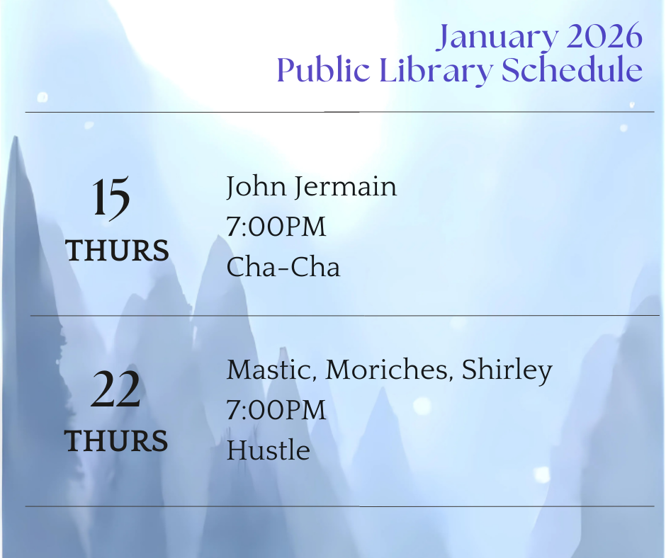 Library Group ClassesCheck your local library newsletter!Suffolk County Jan. 2026 Feb. 2026 Upcoming Performances Feb. 2026 Name Email Address Message Submit